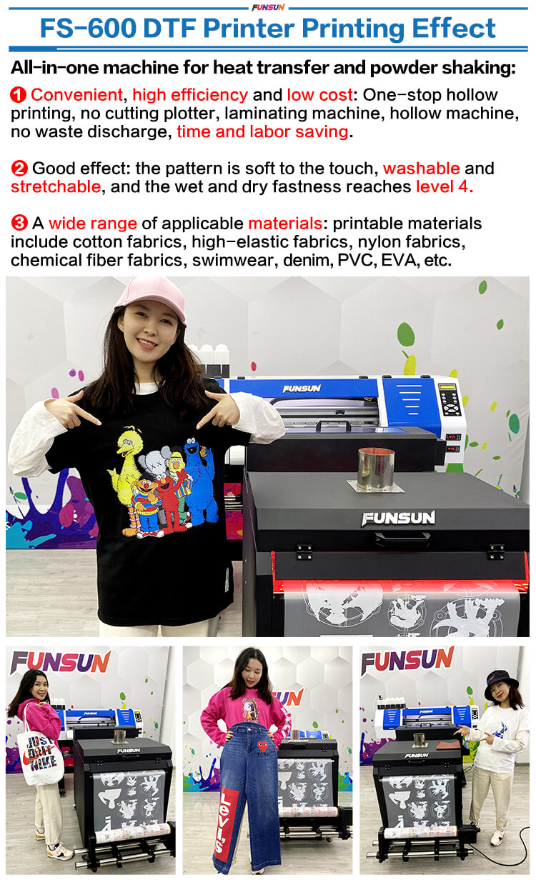 China Best DTF Printer, Diect to film printing, then heat trasnfer to all fabric cloth material, like tshirt, jersery,cap,jeans,canvas bag,shoes,leather…… low printing cost, 1000$ profit/day, really good printing business ! Very detailed manual and videos help you install and use it. What’s more, Free online tech support and service is provided by our engineer team.